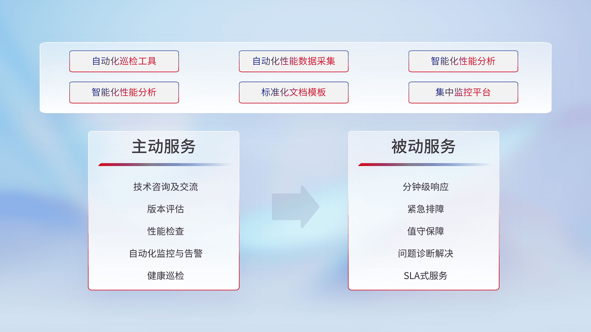 智能化工具和标准化文档,,保障服务质量,,,,提供主动服务(包含技术咨询、、版本评估、、、、性能检查、、、、自动化监控与告警、、、、健康巡检)和被动服务包含(分钟级响应、、、、紧急排障、、、、值守保障、、、问题诊断解决、、SLA服务)。。。