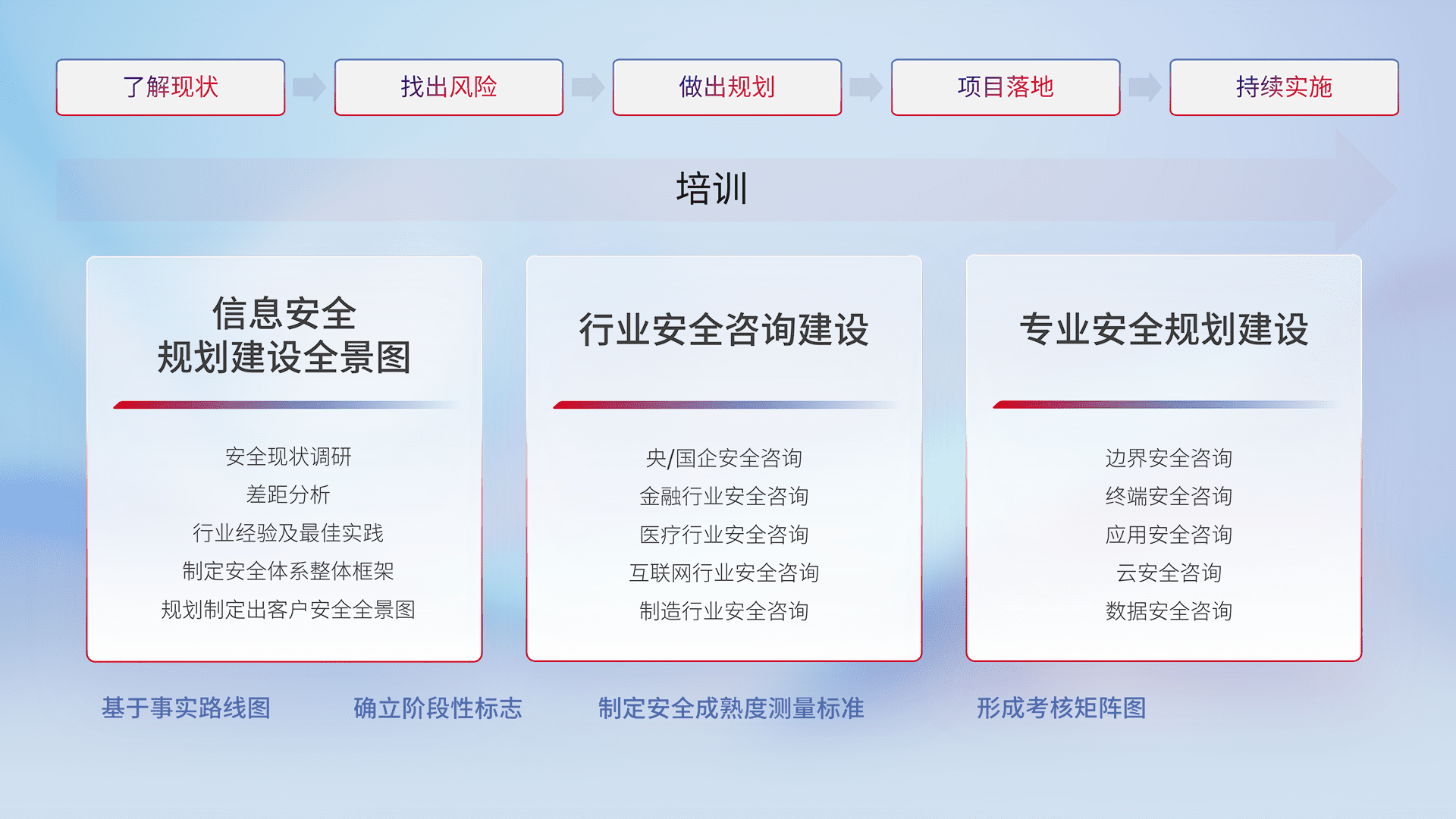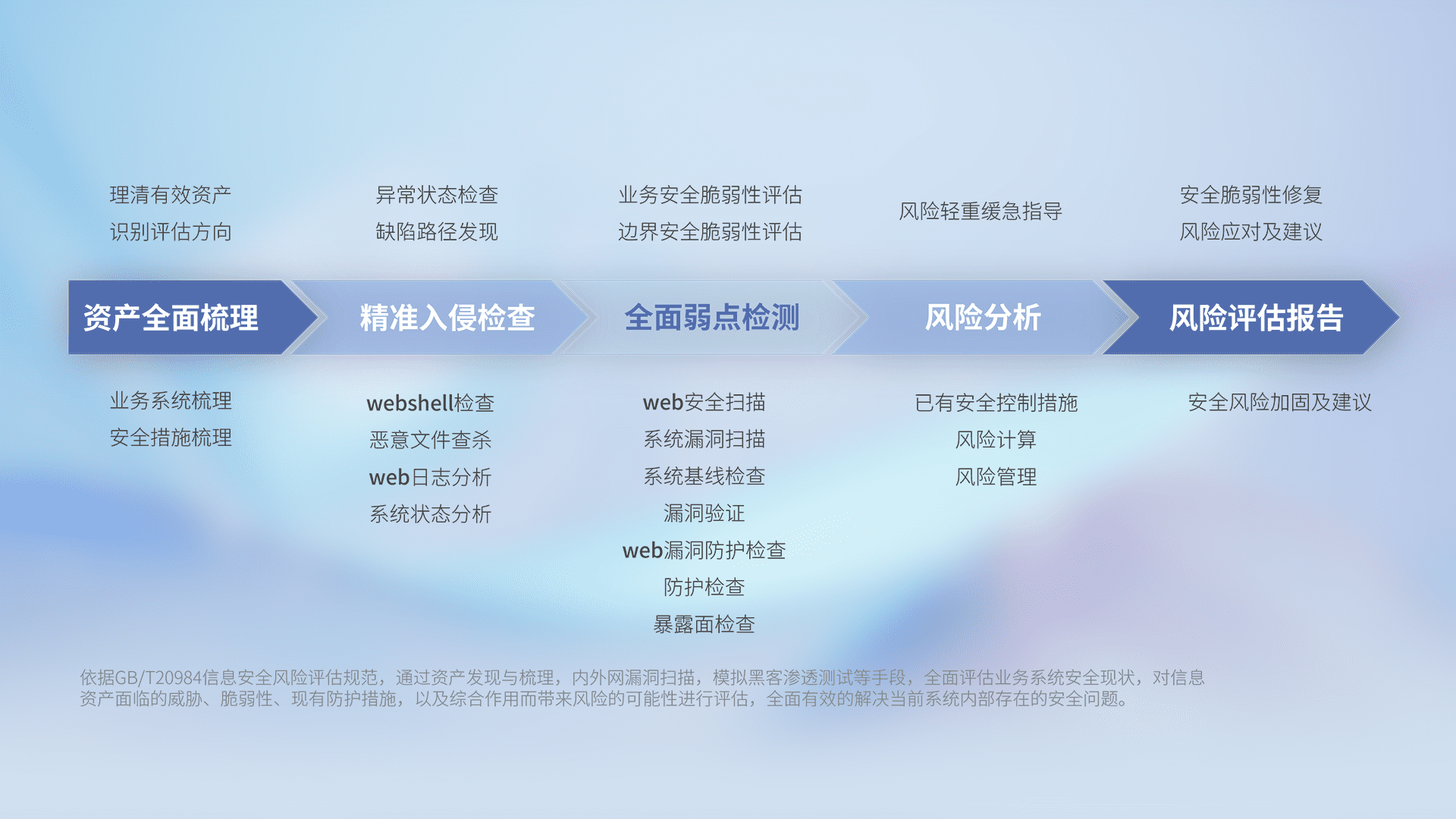针对客户行业特性,,以专业的安全服务+多厂商联合解决方案提供专属的一站式安全管理服务,,,,帮助客户全面感知网络空间威胁,,,,基于识别、、、、检测、、、分析、、、、防护、、监测、、响应的服务理论模型,,,,从方案咨询、、集成交付、、、评估验证、、、优化加固、、、运维运营,,,致力于为客户提供完整的闭环管理式安全服务。。。以实战经验为客户打造高抵御风险的安全体系,,,帮助客户发现威胁、、、对抗威胁、、、处置威胁,,不断积累安全对抗能力,,持续保障数字化安全。。。。